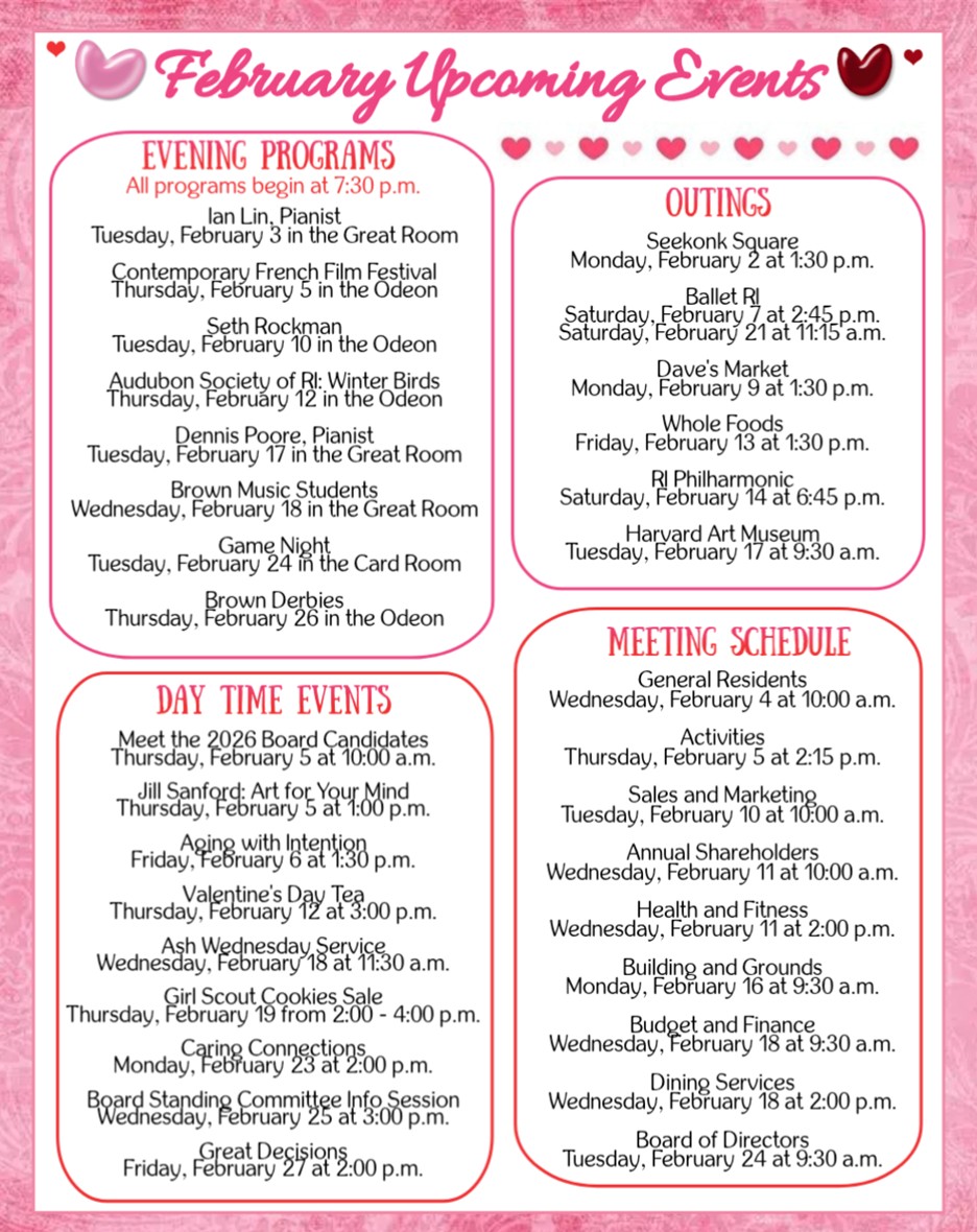 - Activities Committee: Thursday, March 5 at 2:15 p.m. in the Conference Room.