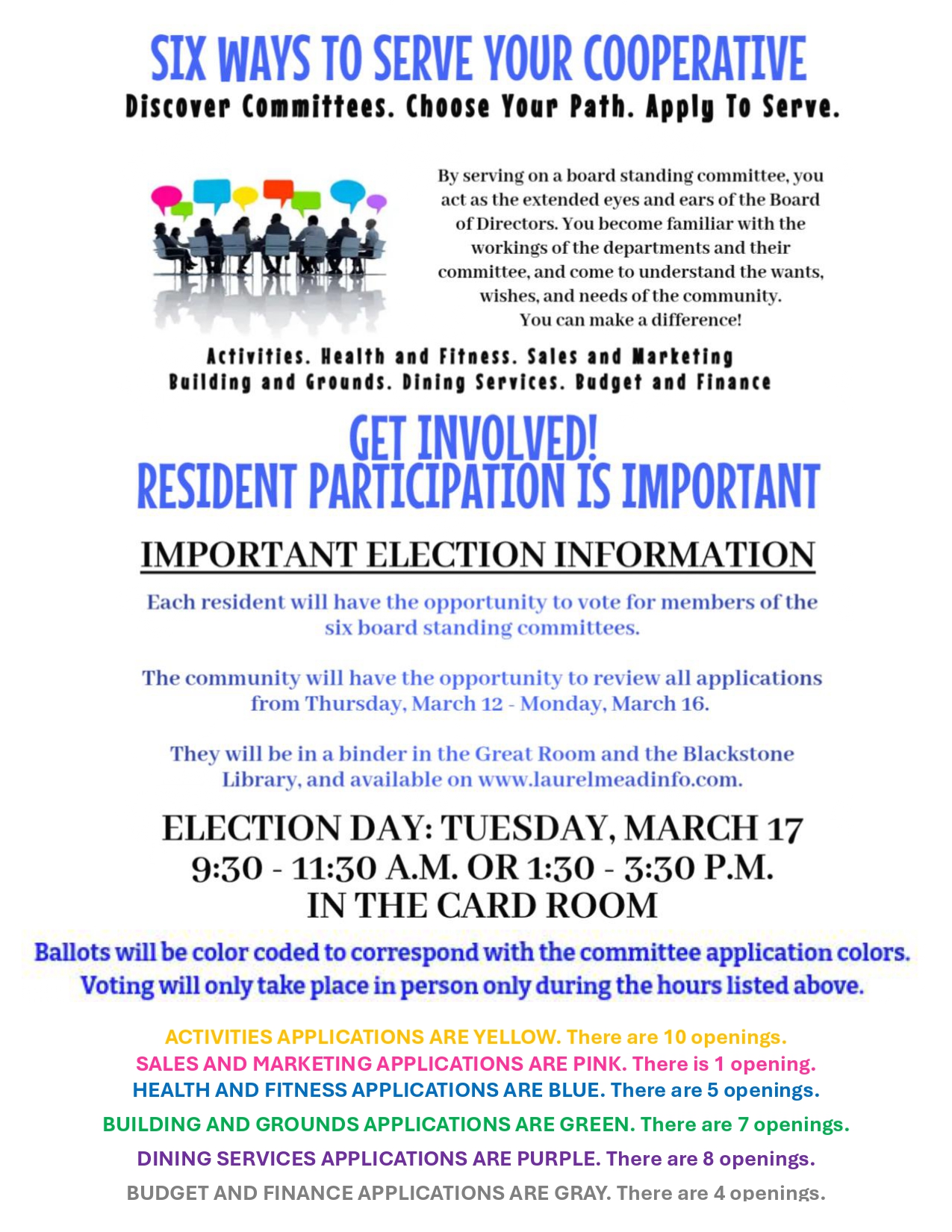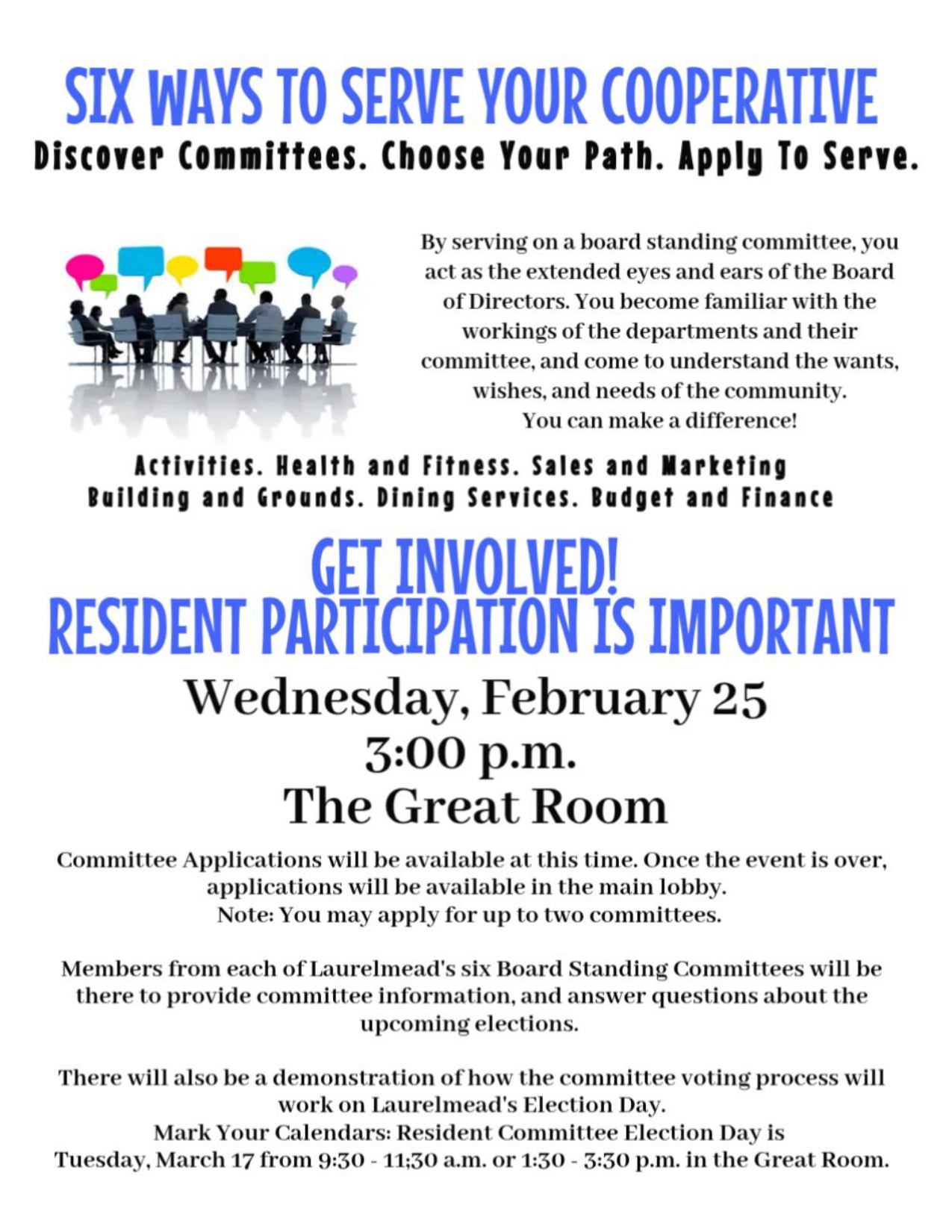 - Dining Services Committee: Wednesday, March 18 at 2:00 p.m. in the Conference Room.