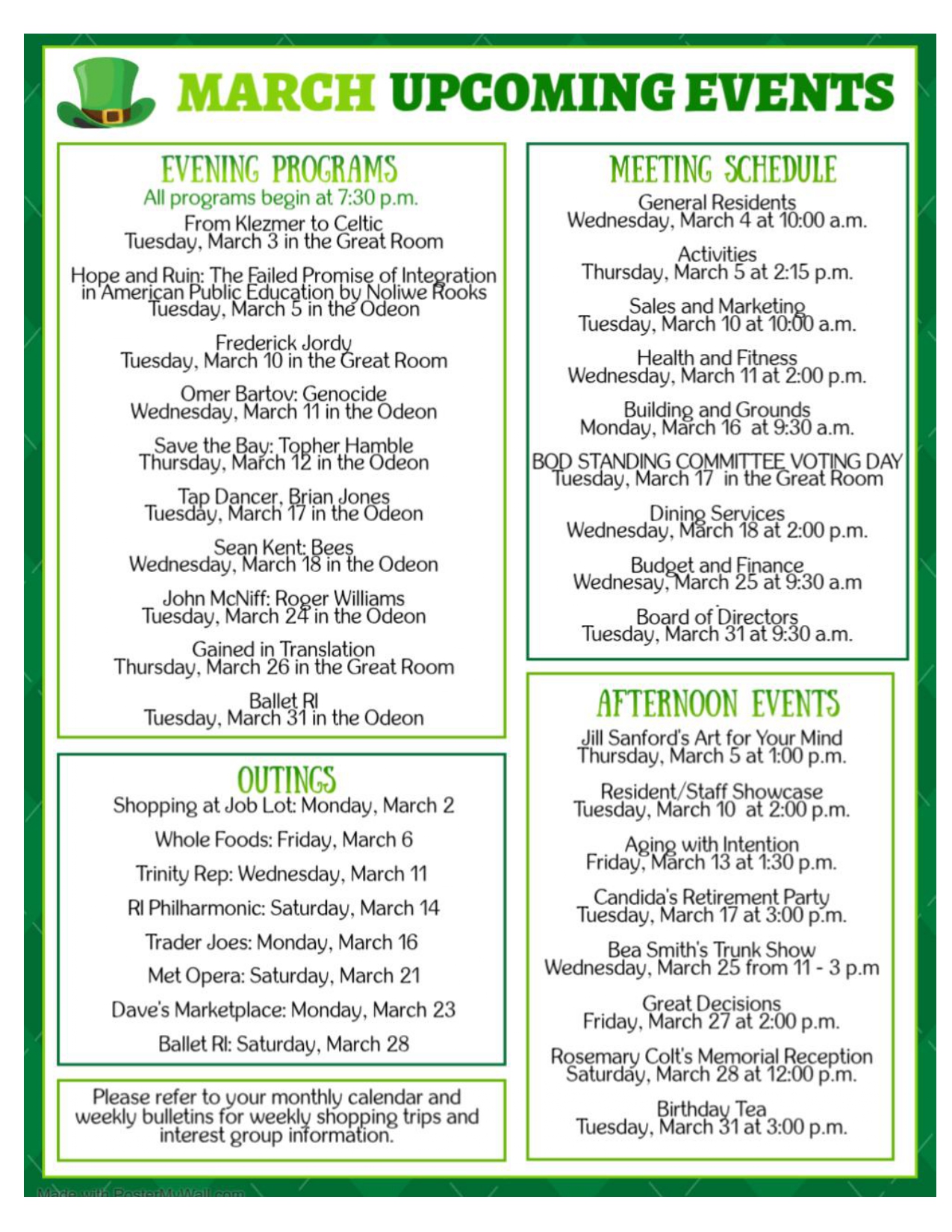 - General Residents Meeting: Wednesday, March 4 at 10:00 a.m. in the Odeon.